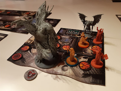 Die mythos kaarten zijn zoals beloofd in het handboek van den hond en doen Cthulhu dichterbij komen maar brengen ook extra monster via de portalen op het bord. Dweilen met de kraan open. Dat vuur is ook moeilijk onder controle te houden.